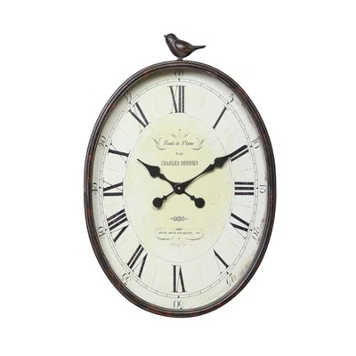Bring an antique touch to your house with this hanging wall clock with metal bird. The metal material makes this a strong wall piece. The antique and rustic metal finish is strong and can complement many different home decor styles. The large Roman numerals and delicately designed center make it a décor piece you will not want to do without.