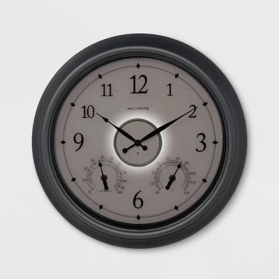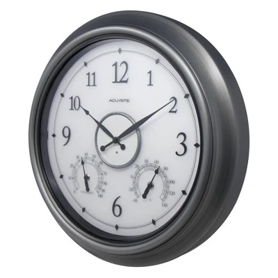 Easily keep track of the time, temperature, and humidity during the day or at night with the 18-inch Pewter LED Illuminated Outdoor Clock with Thermometer and Humidity Sensor. It features an integrated light sensor that automatically activates a warm, ambient backlight during dark conditions. Durable all-weather construction makes this a functional addition to any patio or garden. Also features a reliable quartz crystal movement, accurate temperature and humidity readings, and easy-to-read numbers.