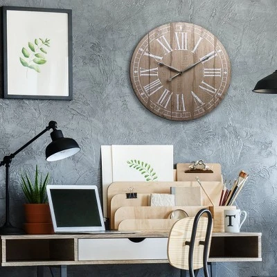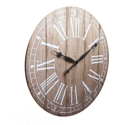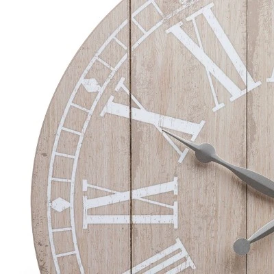- Round wall clock is constructed of wood planks in a distressed weathered finished for a vintage feel