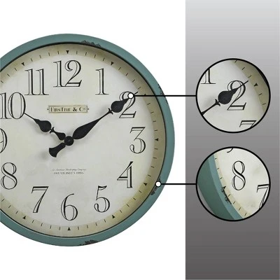 - Crafted of plastic with a teal frame and distressed white clock face covered by a plastic lens
