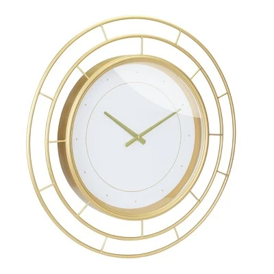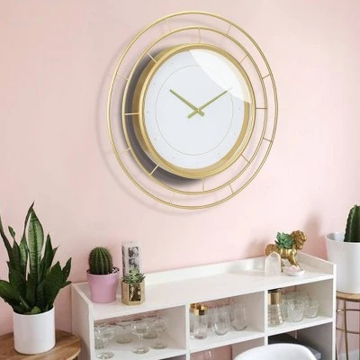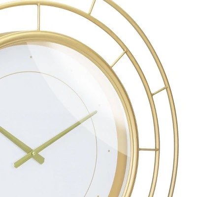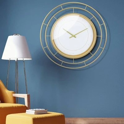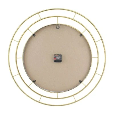 Add a touch of modern flare to your home decor with a Stonebriar 27.5″ decorative round wire metal wall clock. This clock features a gold radial wire metal frame with a white clock face for a clean modern feel. Clock comes with attached keyhole hanger and is easily installed with a screw or wall hook (not included). Clock measures 27.5 inches in diameter and is the perfect size for over the mantel or as an accent for your kitchen, bedroom, office, or living room. Decorative clock is battery operated and requires a single AA battery (not included).