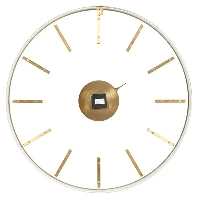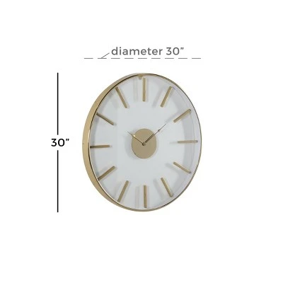 Make a classically elegant statement with this oversized minimal modern wall clock. Crafted from stainless steel finished in high polished metallic gold, this extra-large wall clock does so much more than tell time… The minimalist design and simple dial keeps it clean and chic with neutral tones to complement any space and color palette. The transparent glass clock face overlays any color or pattern your wall holds, creating a floating effect. Easy and ready to hang by the keyhole hardware in the back, this gold clock reliably runs on a single AA battery (not included).