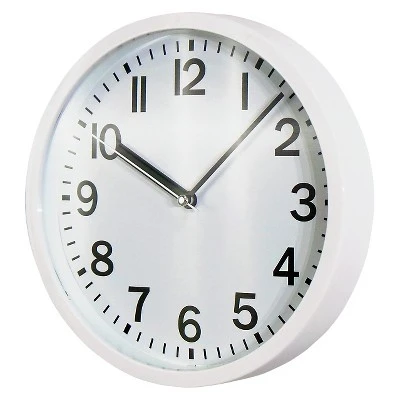 This 9″ Round Wall Clock from Room Essentials™ adds a stylish and practical touch to any room. Made from a white plastic frame with a glass cover, it features bold black numbers that contrast well against the white backdrop to make the time easy to read. The simple design pairs effortlessly with any existing wall decor, and it comes with a 5-year limited warranty to provide you with some extra peace of mind.