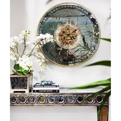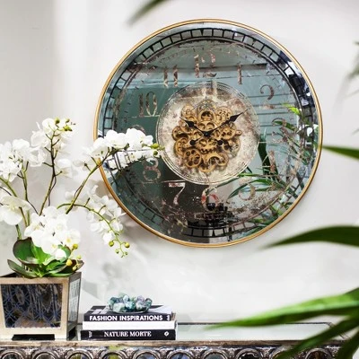 Classic style takes center stage with the A&B Home Wall Clock. A centerpiece clock for the dining room or for pride of place above the sofa—this antique timepiece adds a touch of elegance to any setting. The frosted glass face marks out the minutes and hours with a distressed black and white design. Mesmerizing metallic gears are on full display, making for an intriguing visual wall accent. A subtly glamorous gold case frames the round clock.