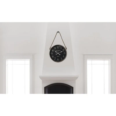 Antiqued, aged ivory finish with rust undertones and distressed, matte black clock face. Rope accent allows the wall clock to hang from the decorative hook that is included or may be hung without the rope. Quartz movement ensures accurate timekeeping. Requires one “AA” battery.|Coastal|Industrial|Lodge|Transitional||Black|Gray|wall clocks, antiqued, aged, ivory, black, rope