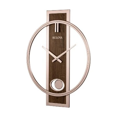 Elevate your room’s appearance with the Bulova Clocks Phoenix Minimalist Metal Slow Swing Pendulum Wall Clock. This clock duels as a decoration piece and time-telling device, complementing a wide variety of decor styles.Daring design at its best. This minimalist wall clock with a walnut-finish center panel makes for a stunning clock in any room in the house. The walnut-finish center panel has a slow-swing pendulum that is also engravable for ultimate personalization.Whether placed in your living room, bathroom, or bedroom, the champagne-colored metal case and hands complement the minimalist styling of any wall. Driven by quartz movement for precise timekeeping, this clock will help you keep track of time all while looking stylish. 3 AA batteries are necessary to operate, but are not included.Add a splash of timeless classic flair to any room in your house with the Bulova Clocks Phoenix Minimalist Metal Slow Swing Pendulum Wall Clock.