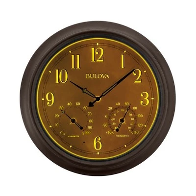 Whether you’re tending to the garden or swimming in your pool, you’ll never have to guess the time with the Bulova Clocks Weather Master Outdoor Wall Clock. This 18-inch clock includes both a thermometer and hygrometer so you’ll always know the exact temperature and humidity level.The clock features a large face with oversized numerals for easy viewing from any angle of your backyard. Its face also illuminates at night for easy viewing no matter the time of day. The clock’s 4 battery-powered LED lights are controlled by a light sensor for automatic illumination.Thanks to the outdoor clock’s sealed gasket, it’s thoroughly weather-resistant and shielded from outdoor elements. You won’t have to worry about rain or heat damage. The clock’s helpful gasket will also work to extend its lifetime.The clock is enclosed by a 2 step metal case with an oil-rubbed bronze finish. It’s sure to look nice in any backyard or patio setting. Batteries are included with this clock so you can set it up as soon as it arrives.Instantly know the time, temperature, and humidity in your backyard with the Bulova Clocks Weather Master Outdoor Wall Clock.