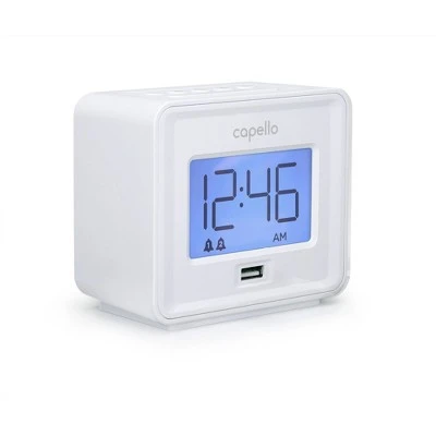 Wake up refreshed and recharged with the Capello Toc Charge Clock with USB charger. This alarm clock is a great fit for any nightstand or bedside that features a fast-charging 2A USB power port right on the front to plug in your smartphone, tablet or other USB devices to charge while you sleep. A blue backlit display with adjustable brightness helps you see the time at night and dual alarms with snooze wake you up. The Toc Charge clock is, electrically, operated (the battery back-up does not power the clock). The battery back-up is used to store the time and alarm settings, if power is interrupted.