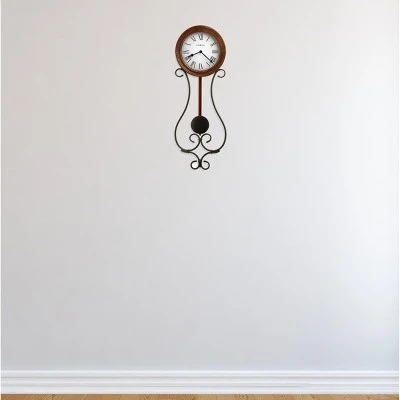 - DURABLE: This indoor modern clock has a sturdy metal frame to relieve stress in a busy household. Display it in your kitchen, office, bathroom, bedroom, living room, and more with a featured warm antique-gray pendulum bob suspended from a cherry-finished wood stick.