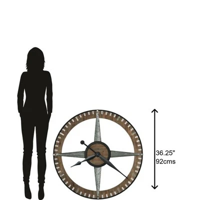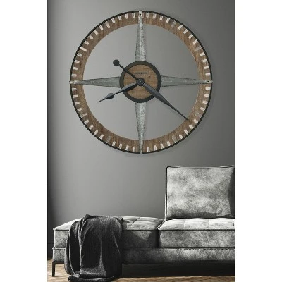 - Perfectly Detailed: Thae details bring it all together on this large wall clock. Beginning with a metal frame finished in charcoal that encircles a distressed wooden ring, the design is neatly supported by tapered and galvanized steel. The effect is mirrored in the center, where a smaller wooden disk is framed by charcoal-finished metal. Rectangular galvanized steel plates accent every hour, while the minute markers are finished with light gray paint. The bold finishing touches are the hour and minute hands, both completed in rich charcoal. The effect is perfectly cohesive throughout.