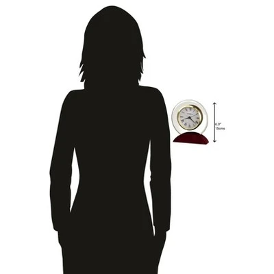 - Timeless Style: The beauty of this eye-catching analog table clock is that it’s anything but ordinary. It’s a masterfully designed creation, from its rounded, beveled glass top to its satin rosewood-finished base, with an arched silhouette contributing to a sense of continuity. At its heart is a crisp white dial surrounded by a polished brass-tone bezel. Roman numerals are etched on the dial, along with hour, minute, and second hands, all in black, and a silver alarm hand. The clock face is gracefully shielded by a glass crystal.