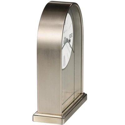 - Elegant Style: Whether you’re looking for function or fashion, the Jefferson table clock will grace your desk or tabletop with its brushed nickel finished metal arch and polished nickel edges and metal base. The clock features a white dial within a clear glass panel, an elegant backdrop for the black Roman numeral, bar-style hour and minute hands, satin nickel-finished bezel, and glass crystal. The metal table clock has a full felt bottom to protect the surface of your desk or tabletop.
