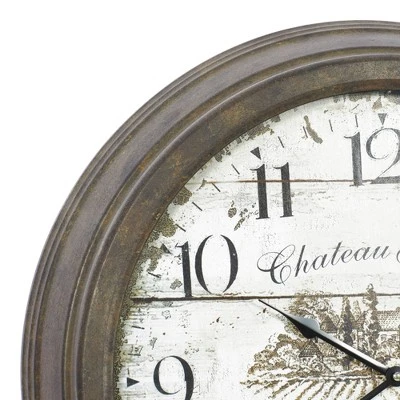 Don’t settle for a basic wall clock to keep you on time! Add this metal wall clock to your space and create a blend of amazing vintage or rustic design. This lovely accent piece provides next level charm and unexpected style to your home. It features a tarnished brown frame with beveled surface and a distressed white clock face with French-inspired illustrations. Feel free to hang this accent decor piece in your lobby, hallway, living room, bedroom, or kitchen. Display on wall with other decor pieces for a more beautiful and stylish home. Requires one AA battery, not Included. This vintage metal wall clock features a quartz face with Arabic numerals and minute marking. The clock mechanism runs silent. A loop hardware is placed at the center back section for easy hanging via nail or screw. Suitable for indoor use only. This large metal wall clock showcases vintage-themed texts of “Chateau Grand”, “Bordeaux”, “1971 Grand Vin De Bordeaux”. This item comes shipped in one carton.