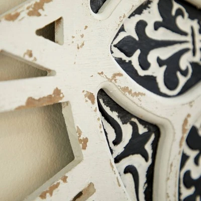 Here is a vintage style wall clock with charismatic and intricate details and is Chinese red pine wood on the front and metal on the back. It features a distressed paint look suitable for a farmhouse, vintage, French province, or shabby chic wall. Roman numbers are carved in the wooden body itself. This clock hangs via a hook and backing and runs on a single AA battery. Diameter is 28″.