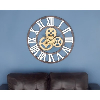 - Extra-large wall clock with analog display, features white Roman numerals on outer frame and three gold clockwork gears on inner frame