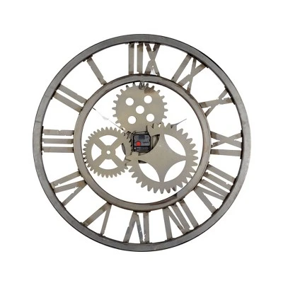 - This metal wall clock accentuates a round flat shape with gear pattern