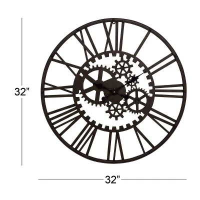 This large industrial wall clock has some seriously awesome old-timey vibes. The large Roman numerals, exposed gears, and distressed black iron frame add an antiquated edge. The gear design provides complementary look for industrial settings. Don’t let the stylish complexity fool you—this large wall clock runs on battery and is easy and ready to hang!. Required 1 AA battery. Roman numerals clock face. The clock mechanism runs silent. Easy and ready to hang. Suitable for indoor use only. This item comes shipped in one carton.