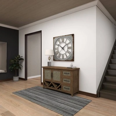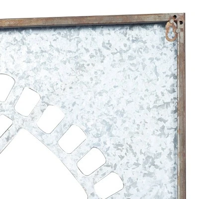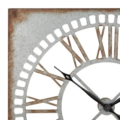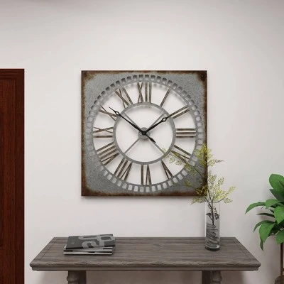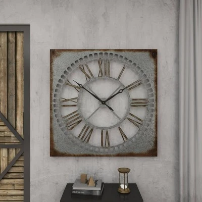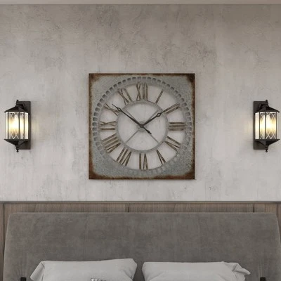 The ultimate in farmhouse style, this extra large metal clock features pierced-out Roman numerals and decorative pierced metal trim inside of a large iron square. The pierced shapes form the round clock center with small squares encompassing the easy-to-read Roman numerals. The reflective galvanized metal construction bounces light beautifully, and the decorative rust trim adds extra dimension and an authentic antique Farmhouse feel. Requires 1 AA batteries Not Included. The clock mechanism runs silent. Suitable for indoor use only. This item comes shipped in one carton.