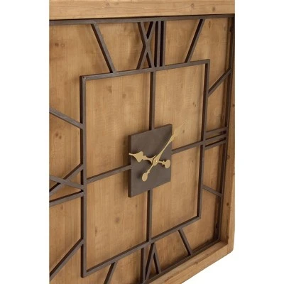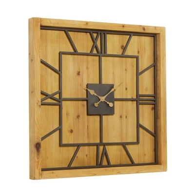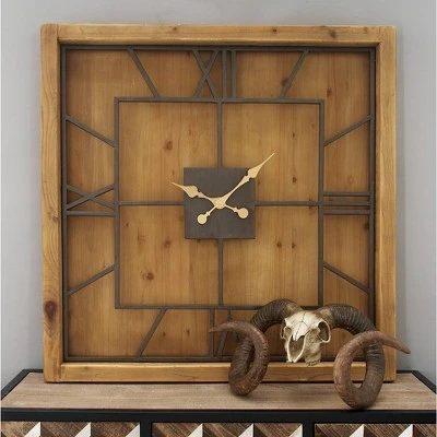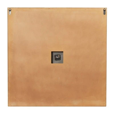 Time is of the essence, no matter where you are. And what better way to stylishly keep track of time at home than this oversized clock. The open-faced clock features a metal clock face in deep brown finish and gold hands. The clock is then mounted on a square Chinese fir wood frame with a natural brown finish. This wall clock is an excellent time-keeping accent in modern and natural and farmhouse themed homes. This item runs on one AA battery. This wall clock uses Roman numerals on to represent the hours. The clock mechanism runs silent. Suitable for indoor use only. This item comes shipped in one carton.