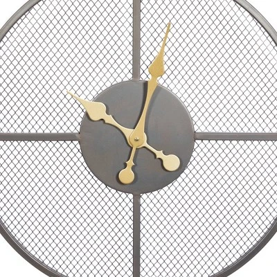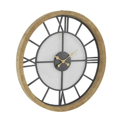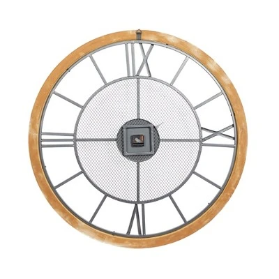 - This oversized wall clock showcases a textured wooden brown finish, a matte gray iron body finish, and a matte gold iron clock hand finish