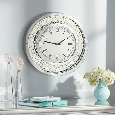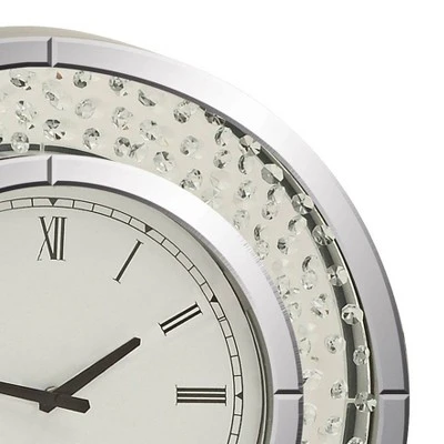 Add a touch of sparkle to contemporary decor with this mirror finish wall clock. It features a stylish, round frame with black Roman numerals. Chic and simple, it adds style and function to the kitchen, living room or study.